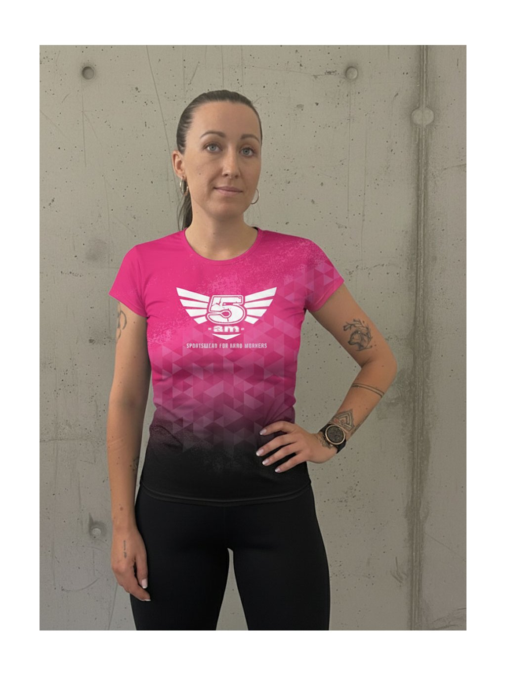 Dámské růžovo-černé funkční tričko s logem 5 am. Tričko je vyrobeno z kvalitní prodyšné funkční látky, dobře odvádí pot a je rychloschnoucí.